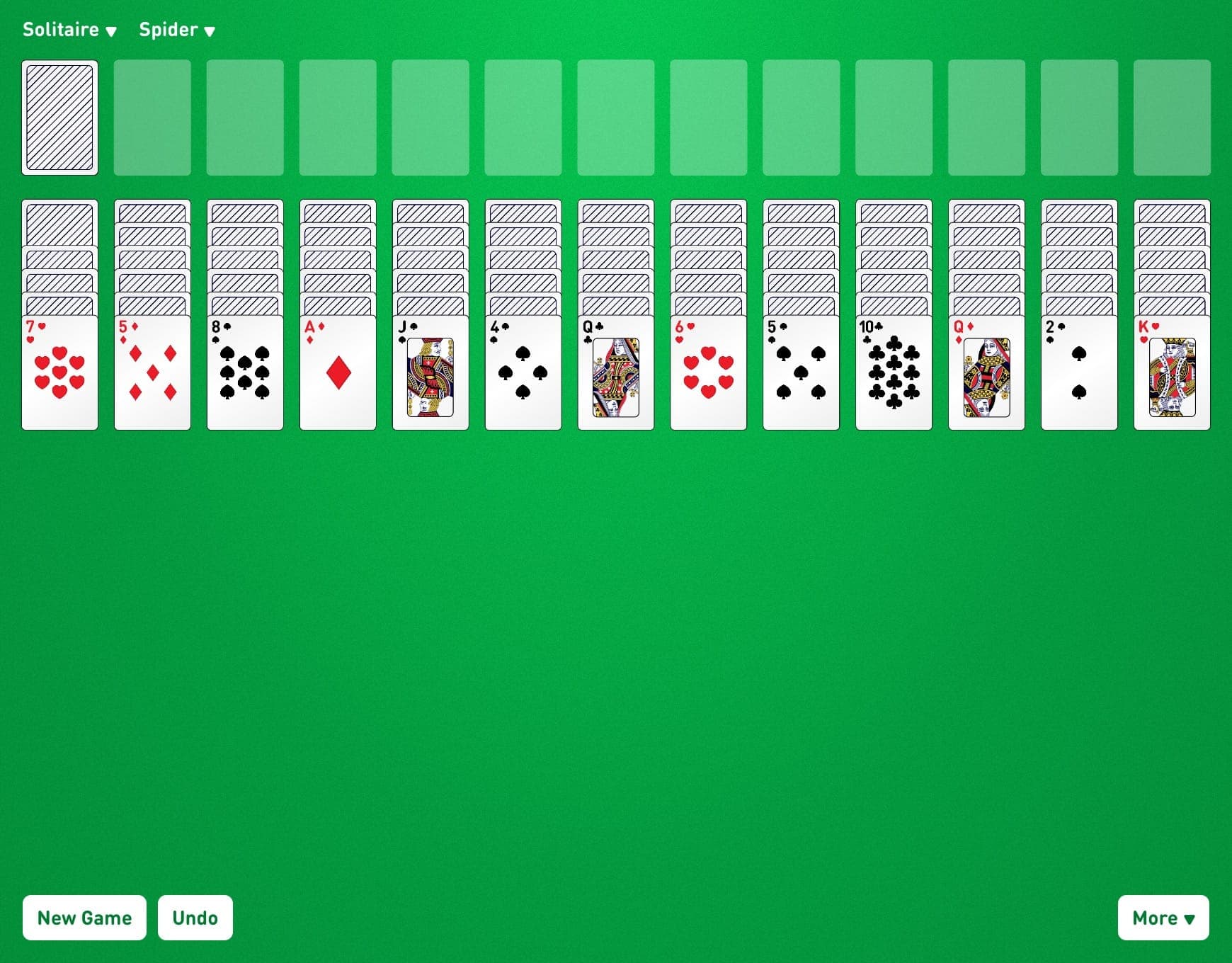 Big Spider is a fun Solitaire variation and is free to play online. A feature-rich full-screen card game with daily challenges, winnable deals, hints, and undo's. Big Spider Game Layout