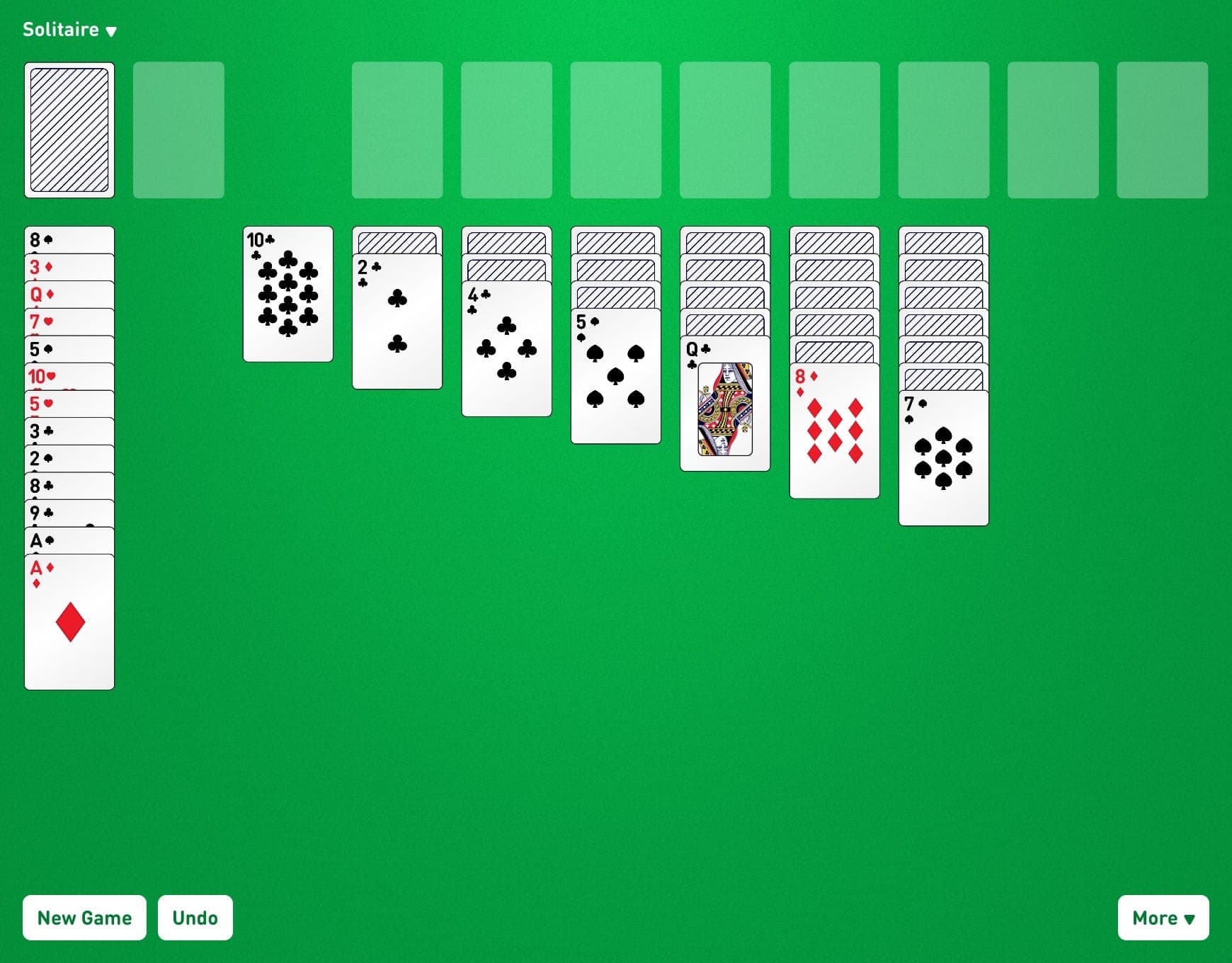 7 tableau piles: Alternate color build down. Only one card can be moved at a time. Any card not in the reserve can fill these spaces. At the beginning of the game, one card is dealt to the first pile, two to the second, and so on. The top card is shown.