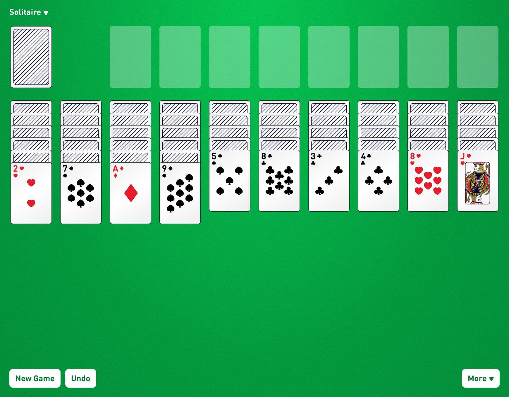 Stock: By clicking on the Stock, you can deal one card to each tableau pile. Before you can accomplish this, all tableau piles must have at least one card in them.