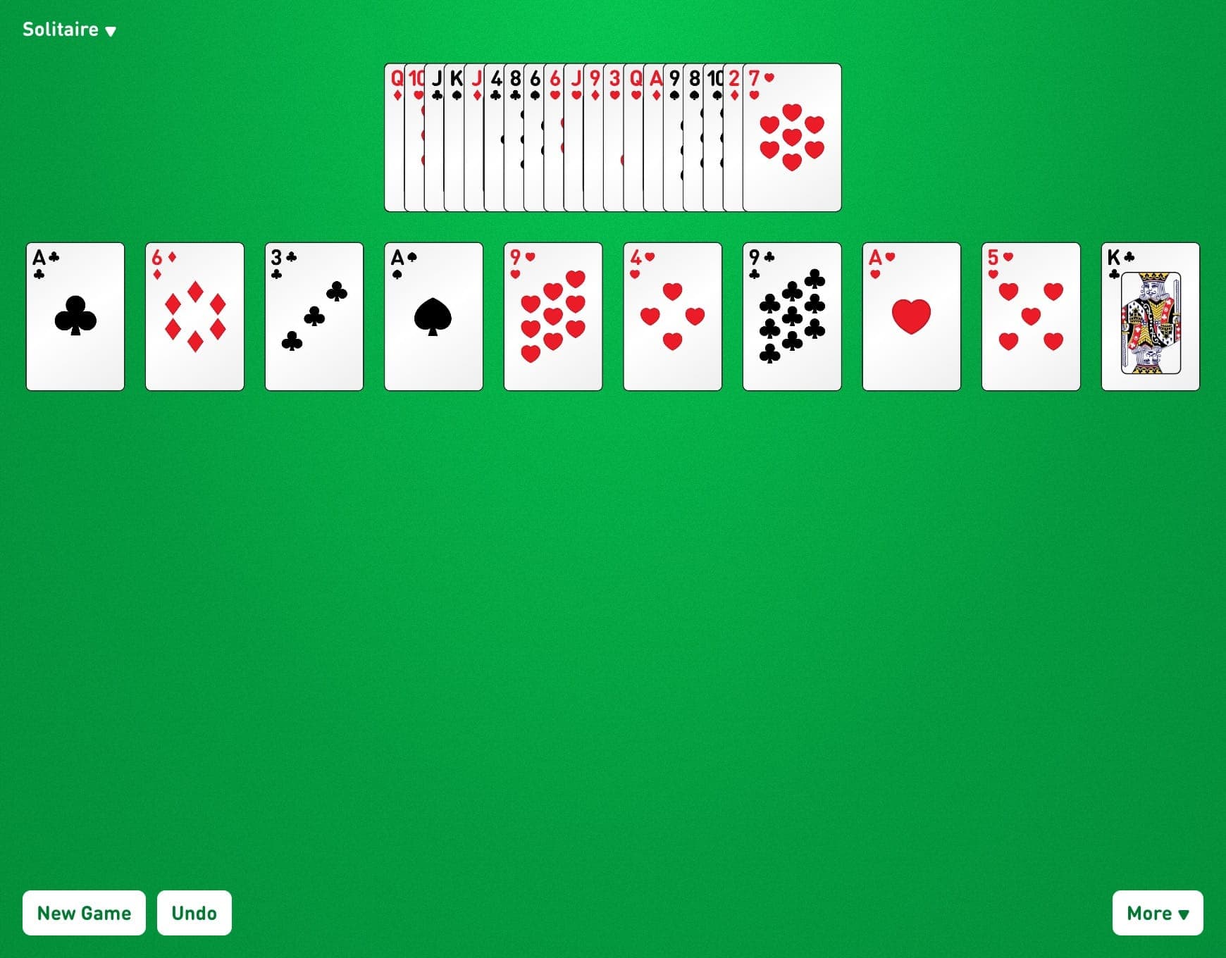 The goal is to bring all of the cards into play by stacking them up regardless of suit, which brings more cards into play through the empty spaces produced. If all of the cards from the stock are moved into the tableau, the game is over.